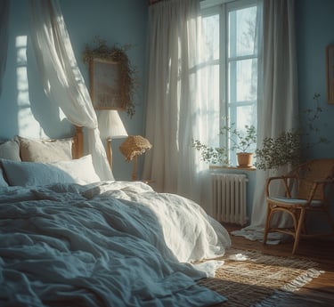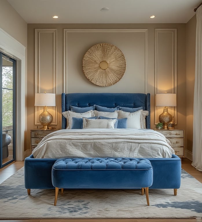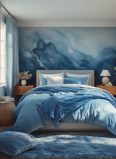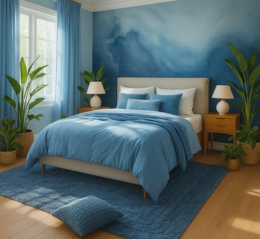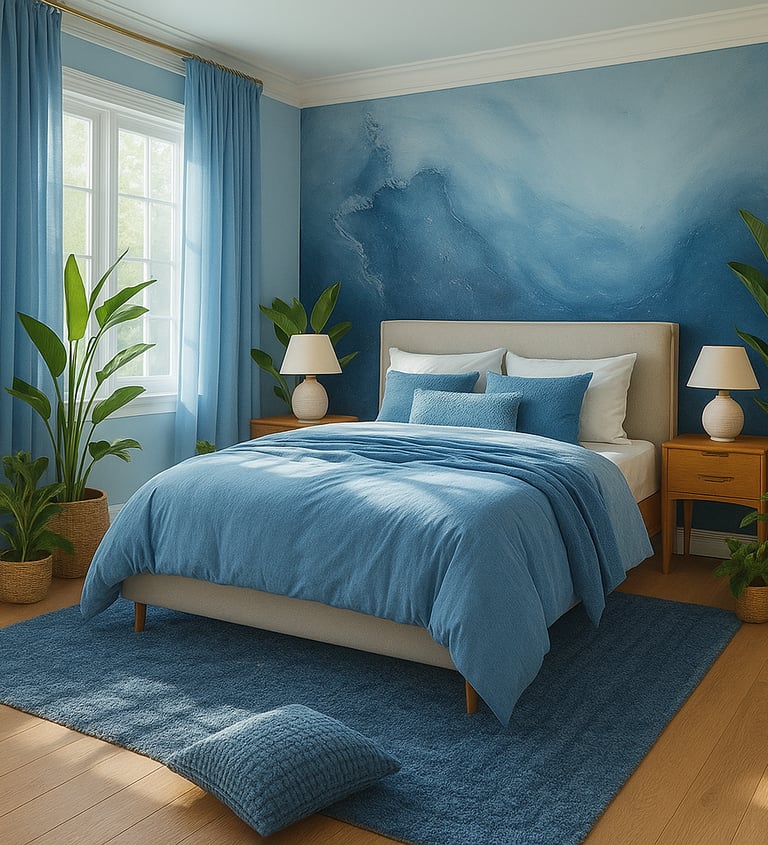 For a grounded yet serene space, mix blue tones with beige or sand-colored neutrals. The balance of warmth and coolness makes the bedroom feel soft, balanced, and organic.