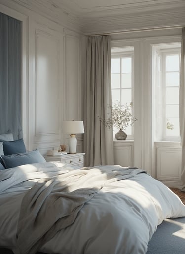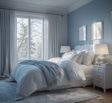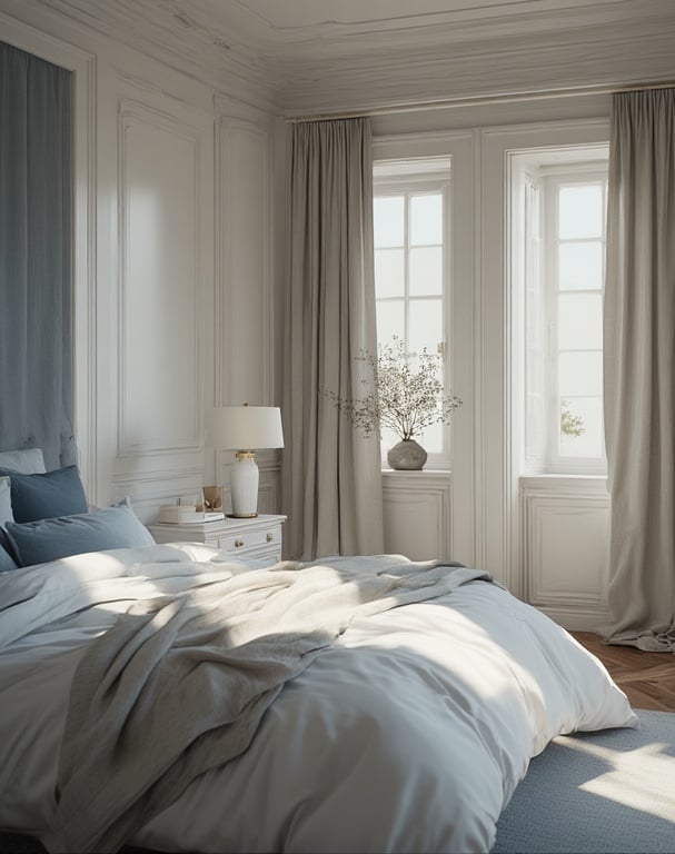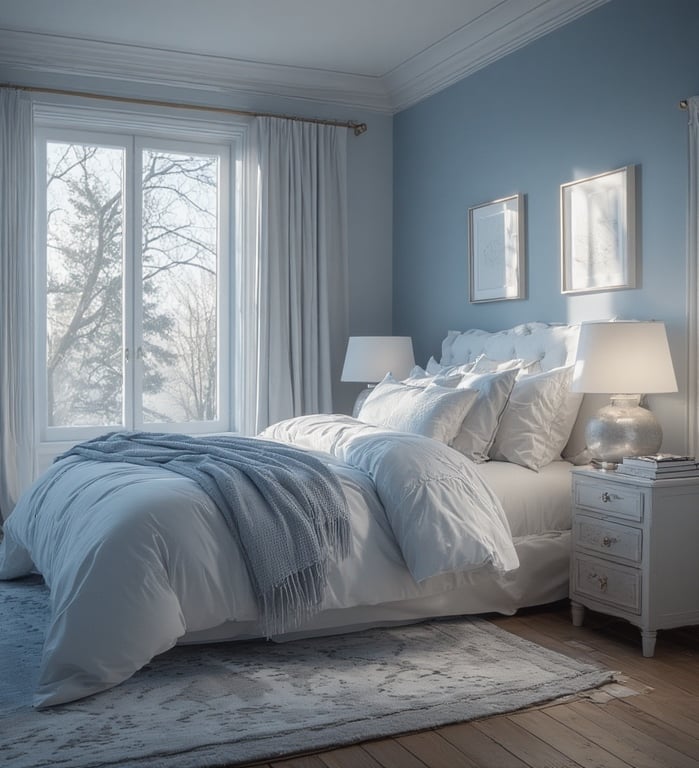 Layer light fabrics like cotton and voile, and accent with glass lamps or silver details for a crisp touch. This palette captures the stillness of a blue morning sky — pure, uncluttered, and soothing.