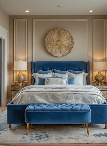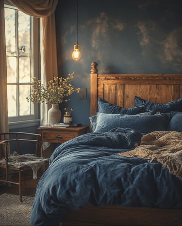 Deep indigo and navy tones create intimacy and sophistication. When paired with warm brass lighting and velvet textures, the room feels like a quiet retreat designed for rest.