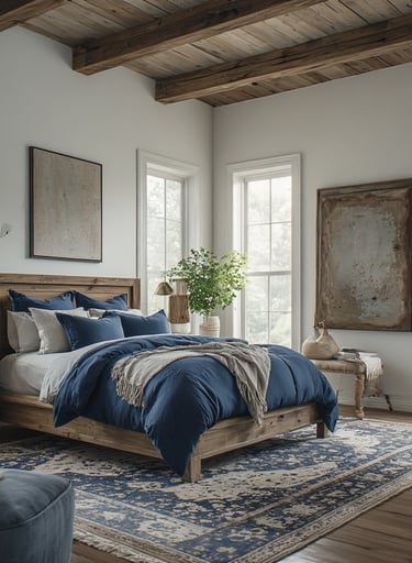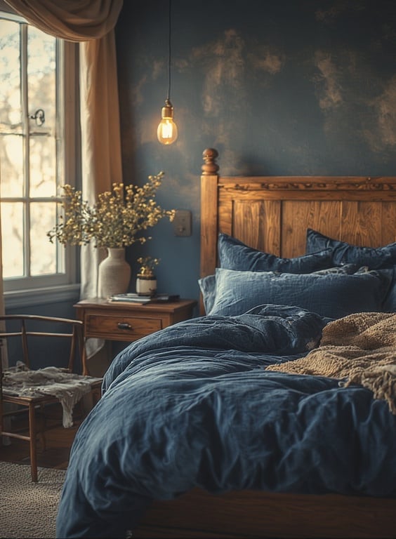 A mix of rustic wood and modern blue accents brings warmth and texture. Try navy shiplap walls or a reclaimed wood headboard paired with light blue bedding for cozy contrast.