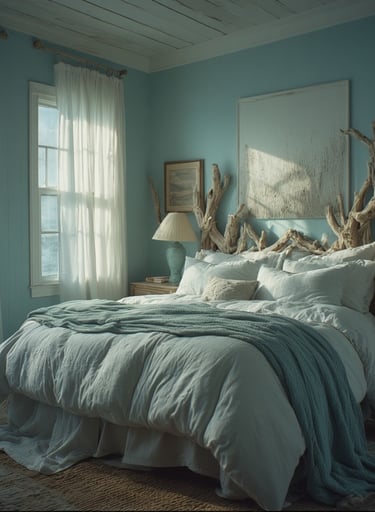 For a true coastal retreat, go all-in with airy blue and white tones accented by driftwood, coral, or sea glass details. The atmosphere should feel like a holiday home you never want to leave.