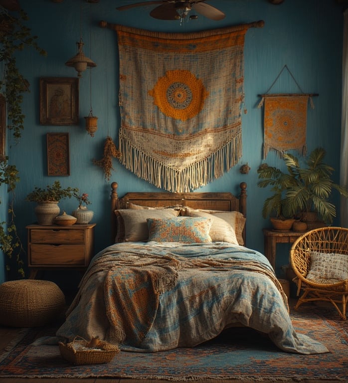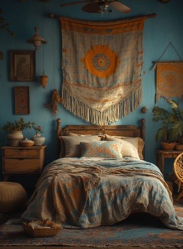 Bohemian and blue make a dreamy pair. Start with muted indigo tones, then layer patterned textiles, woven baskets, and natural fibers for a laid-back yet stylish feel.