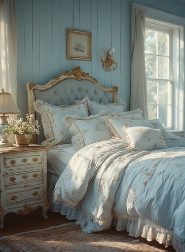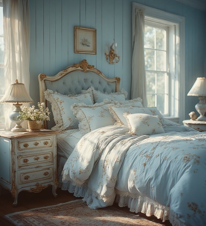 Inspired by the French countryside, this look combines soft powder blues with whitewashed wood and delicate florals. It’s feminine, timeless, and light-filled — like a charming guest cottage by the sea.