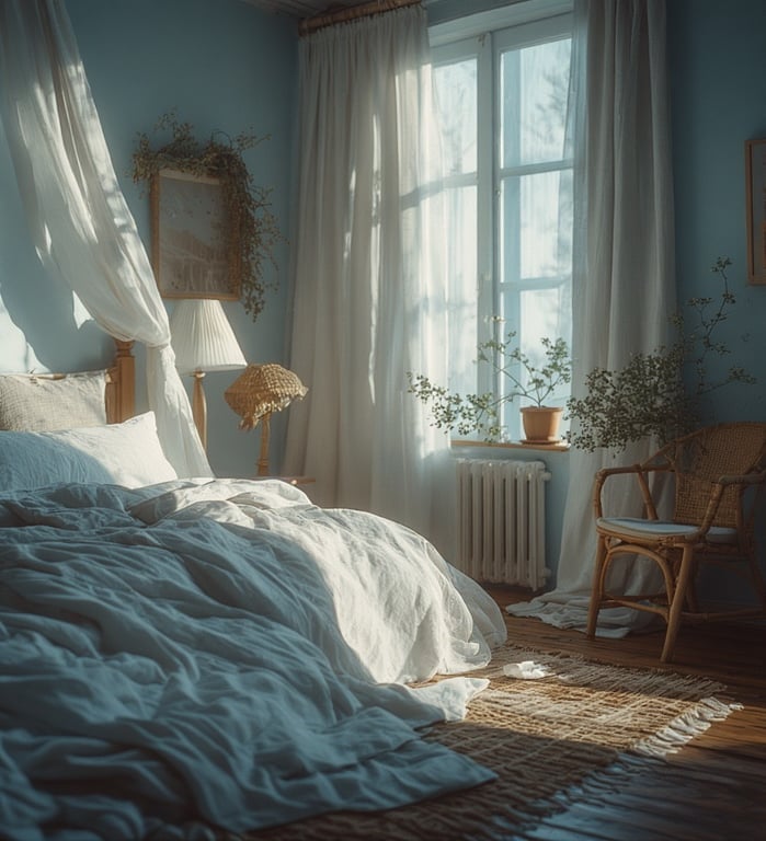 Keep the textures breathable and organic: linen, rattan, and raw wood. Natural sunlight and minimal clutter are your best friends here. The overall vibe is relaxed, sunlit, and coastal chic.