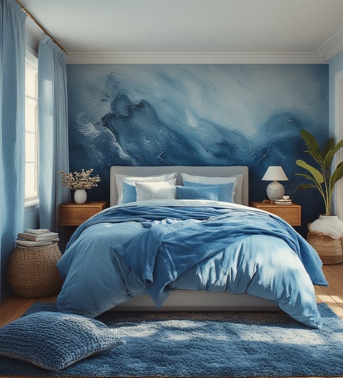 Layering multiple shades of blue adds instant sophistication. Combine pale, medium, and dark tones across walls, bedding, and decor for subtle movement and harmony.