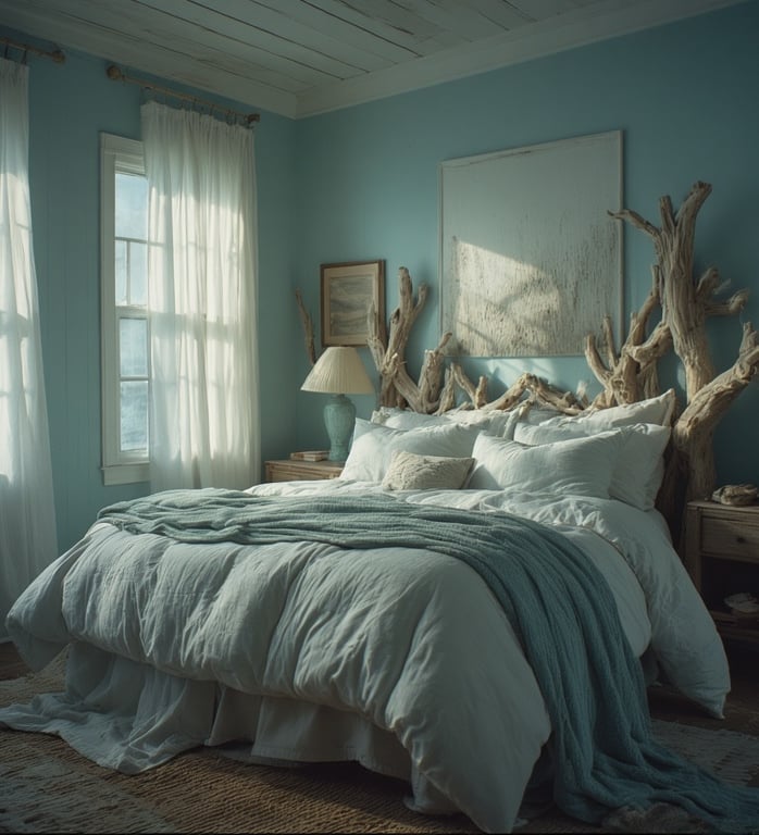 Soft, sea-inspired tones bring an instant sense of peace. Pale aqua walls, white linen bedding, and driftwood decor evoke the feel of ocean air and open horizons. It’s simple, bright, and restorative — like waking up by the shore every morning.